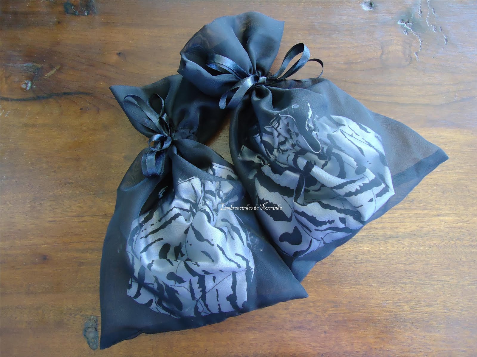 EMBALAGEM : Saquinho em organza ou tecido similar, com uma fita de cetim preta embutida para dar um laço final.Para fazer as divisórias internas, é cortado no tecido do forro, dois circulos em tamanho menor, custurados juntos e virados; depois pregado com pespontos fazendo as divisões, conforme mostro fotos por dentro e por fora.