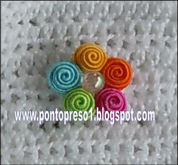 Detalhe : Brochinho de fitinhas com uma pérola furtacor ... fiz as rosinhas conforme mostro abaixo, com ajuda de um alfineite e fitas coloridas dobradas ao meio, enrolo e prendo numa base de perlon em circulo; depois, colo uma pérola no centro; Ficou bem charmosinho . . . rs . . .
