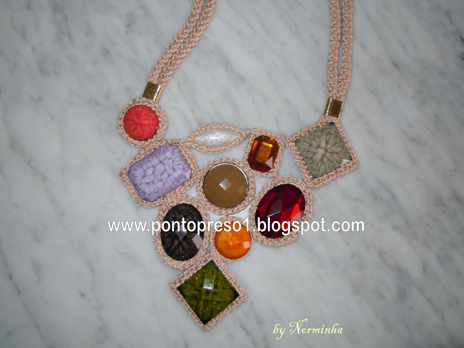 tenho visto alguns colares de crochê pela net e, sinceramente, este foi o que me agradou. O tipo do fio e a pedraria contornada ficaram muito bonitos! Só posso cumprimentá-la pela peça exclusiva que criou! Parabéns flor!
