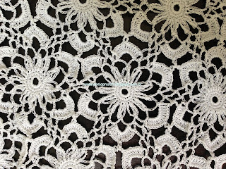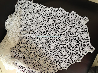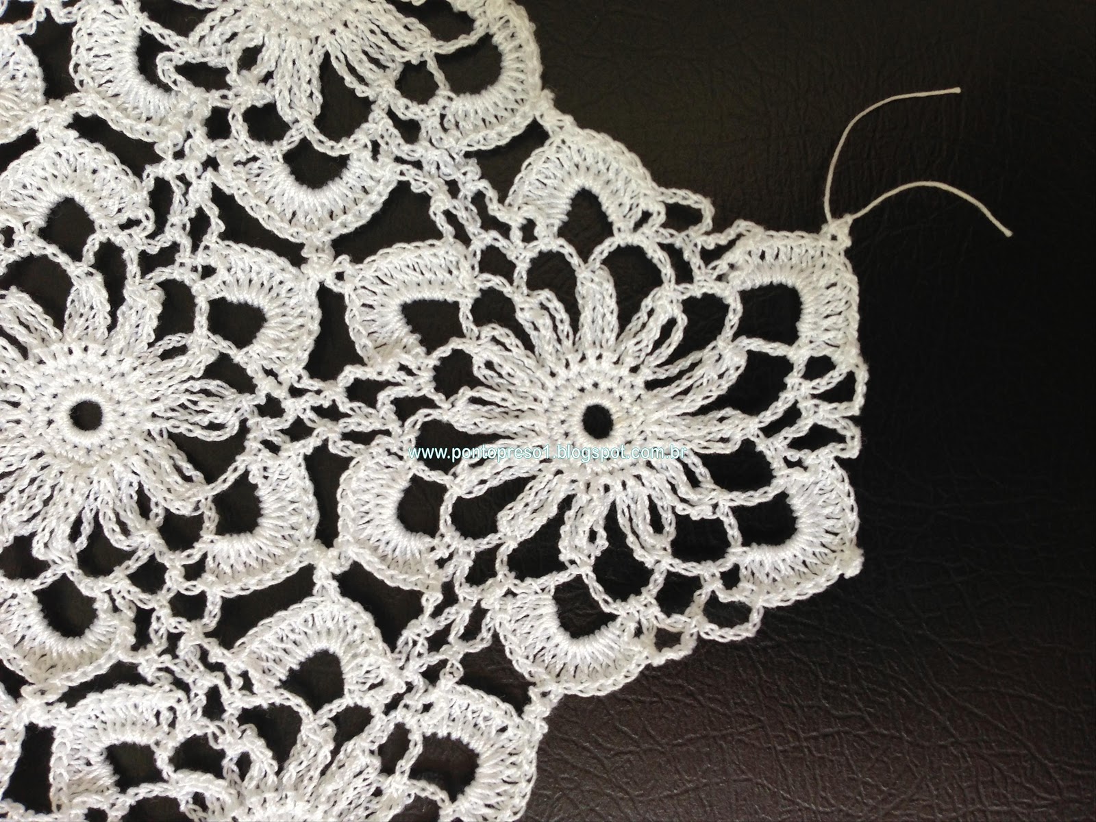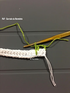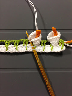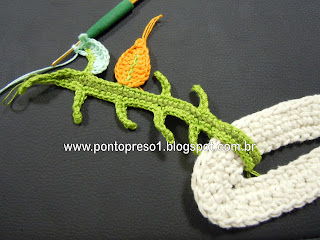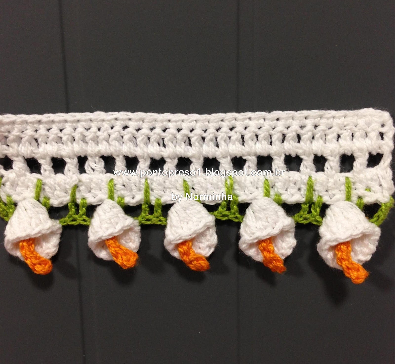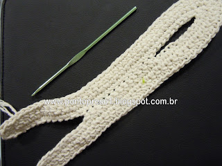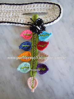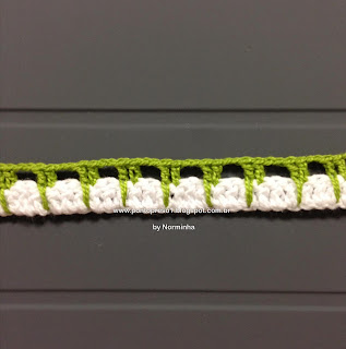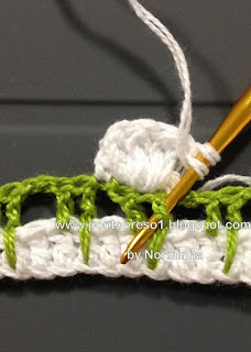 Para dar graciosidade, contornei o acabamento do decote com pontos baixos e picos; fiz uma pequena Flor e prendi com um botãozinho ...No último babado, também contornei com pontos baixos e picos;