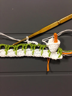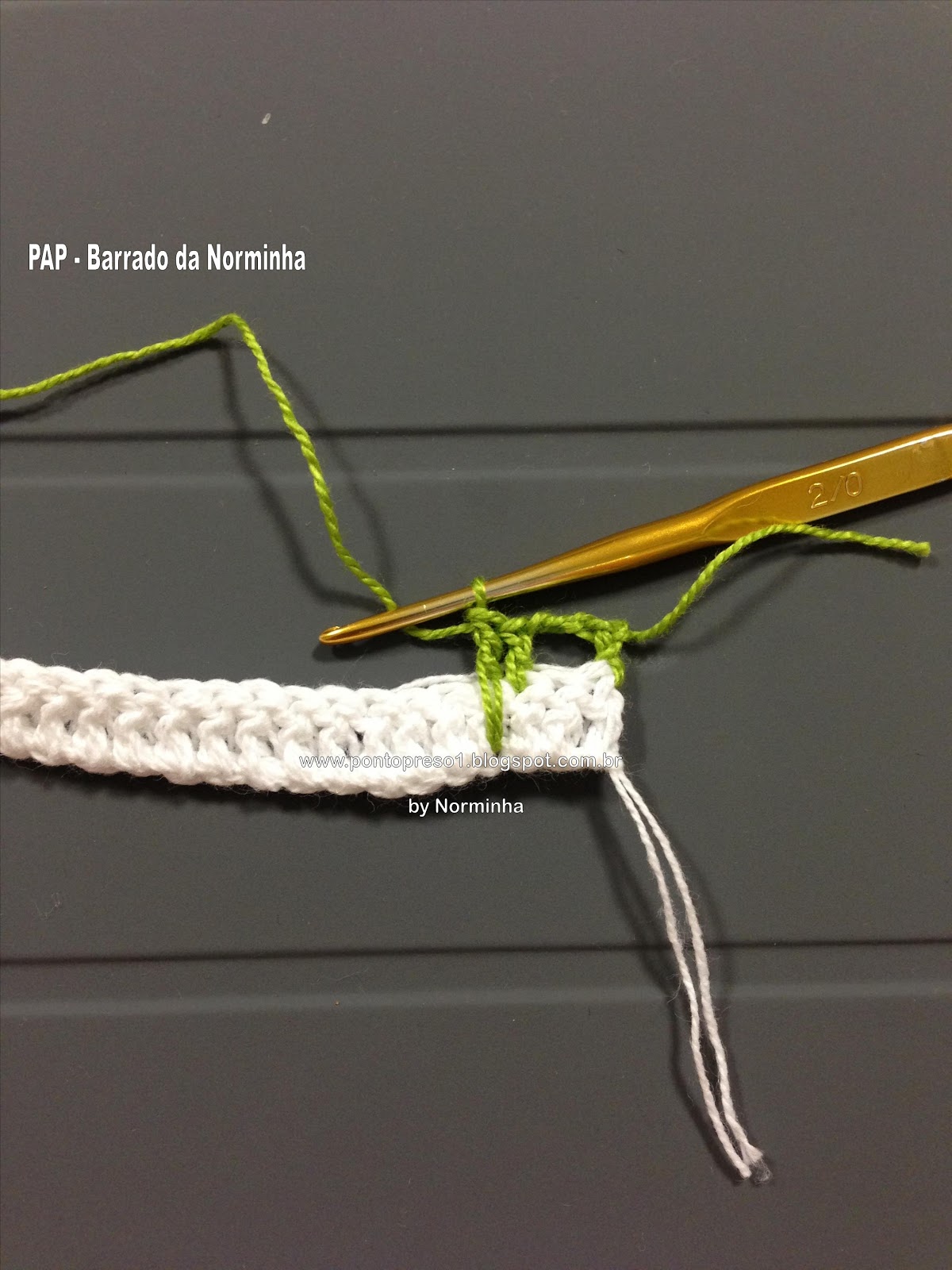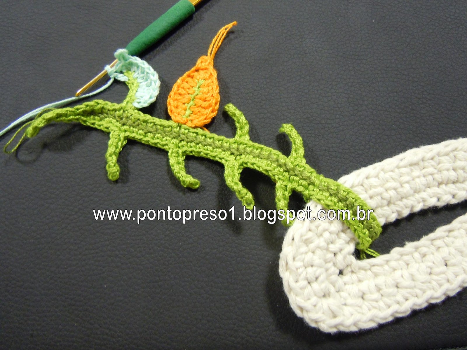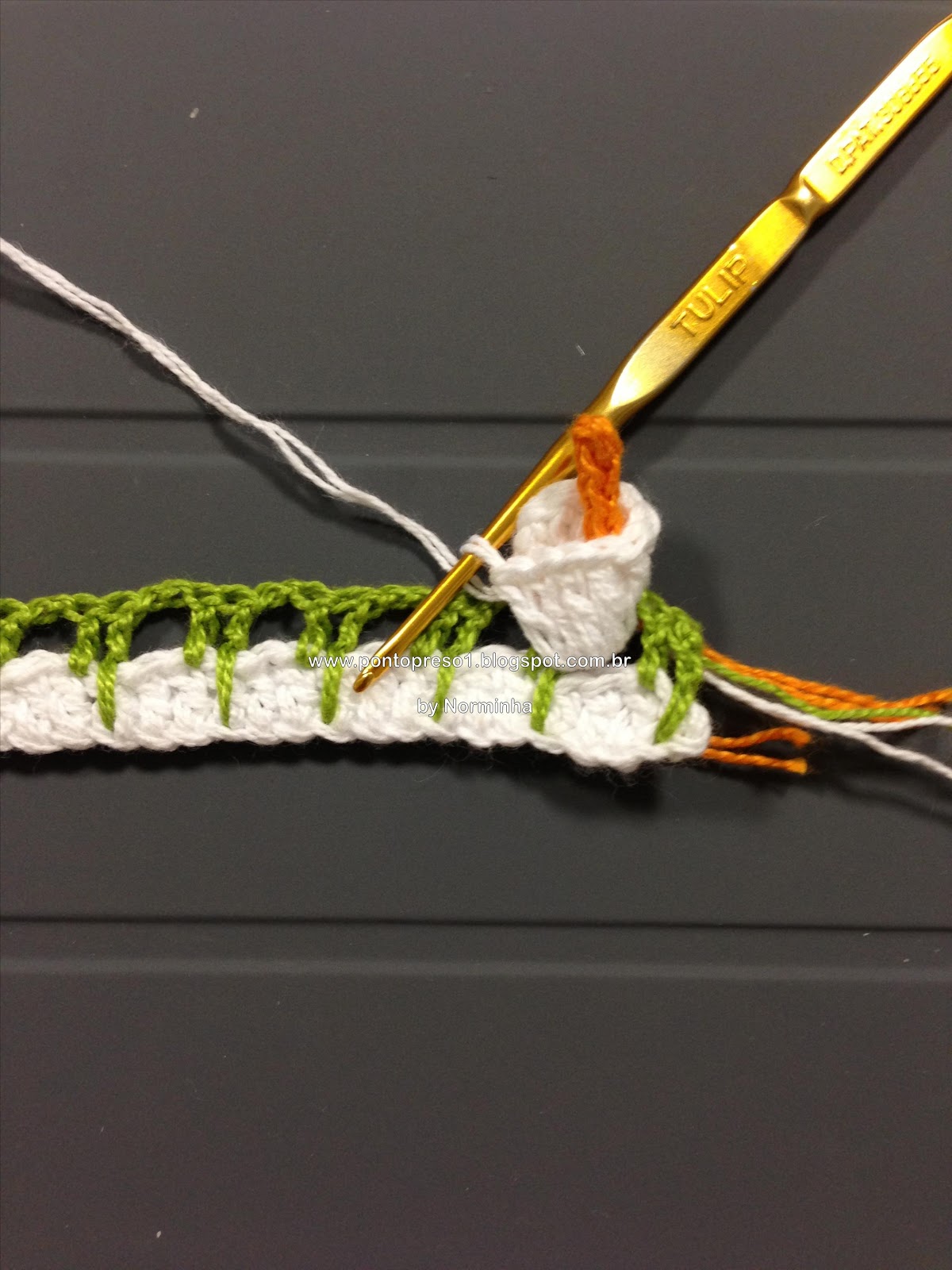 Para dar graciosidade, contornei o acabamento do decote com pontos baixos e picos; fiz uma pequena Flor e prendi com um botãozinho ...No último babado, também contornei com pontos baixos e picos;
