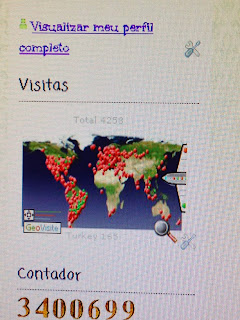 Hoje, meu contador de visitas atingiu um numero inesperado e desejável 4.258 ... embora, os comentários não estejam nas devidas proporções por economia de palavras ou talvez, por ser um blog simples sem badalações promocionais/visuais atrativas... rs .... fico FELIZ ! Agradeço o carinho de totas vocês, que só me estimulam para novos projetos!