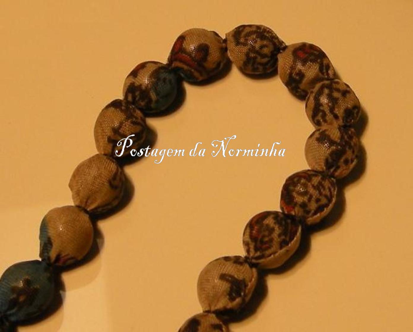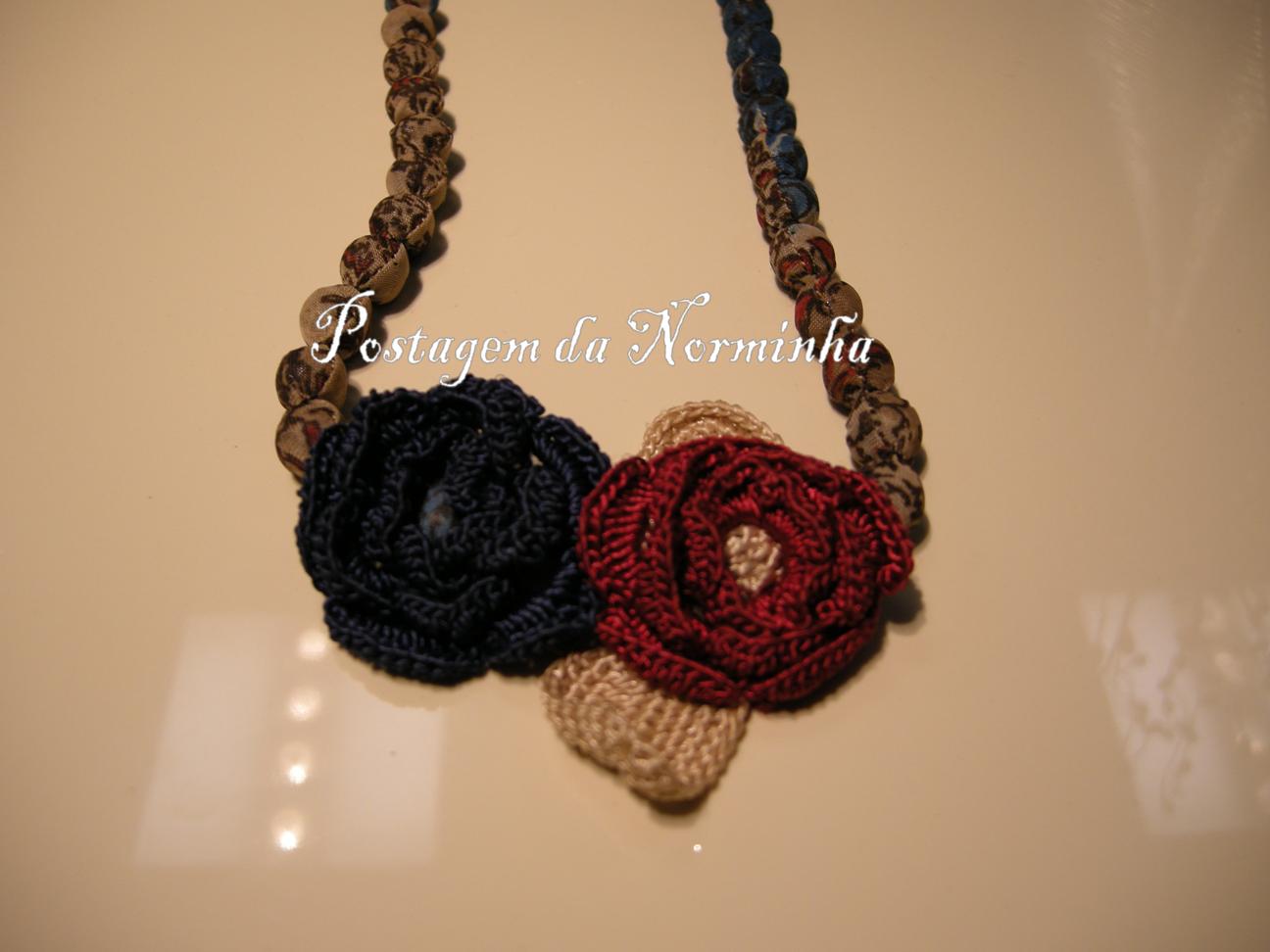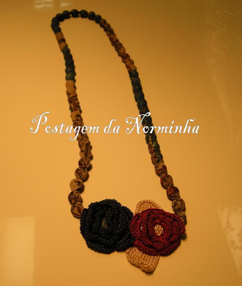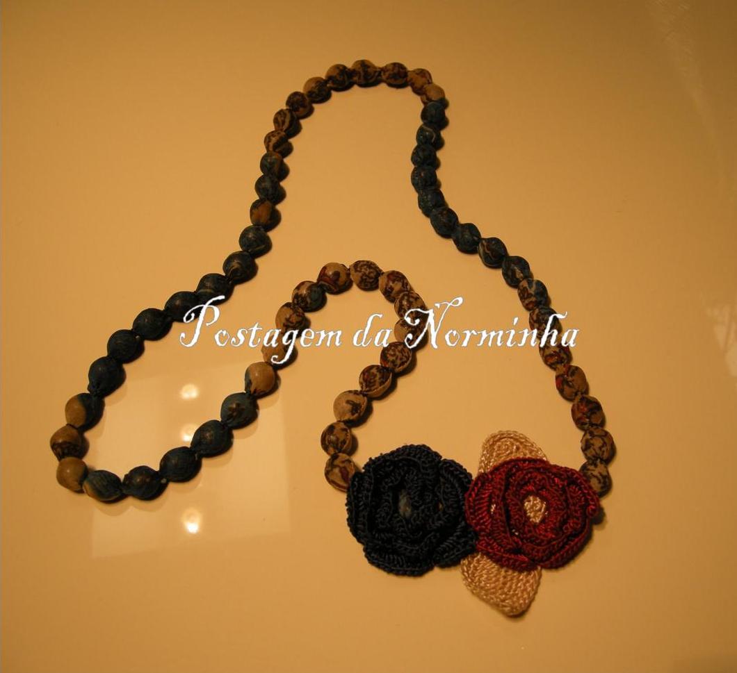 Gostaram ? Pois é bem simples de se fazer : Passe contas em um nylon no tamanho desejado; faça um rolutê (largura) de acordo com o tamanho das contas, em tecido de estampa bonita (em seda fica maravilhoso!) e passe o cordão com as contas por dentro; pegue uma agulha e linha e vá dando voltas e prendendo com pequenos pontos em cada junção das contas; arremate juntando as duas extremidades; faça as flores em croche, com a linha acetinada e aplique na peça. PRONTO ! Está super charmoso o seu COLAR ! rs...