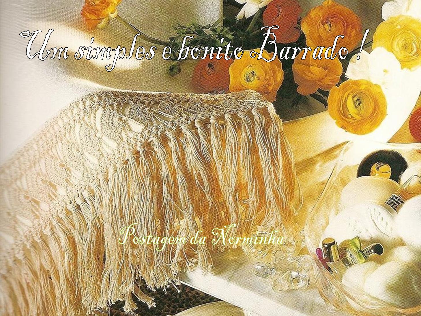 Este Barrado esta quentinho... ganhei estas REVISTAS - Mimos do meu irmão, e já fui praticando ... (na revista não tem o grafico desta trama, mas voce pode encontrar aqui : http://oficinadobarrado.blogspot.com/2010/01/blog-post_09.html depois é só fazer a base;