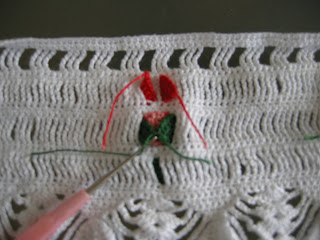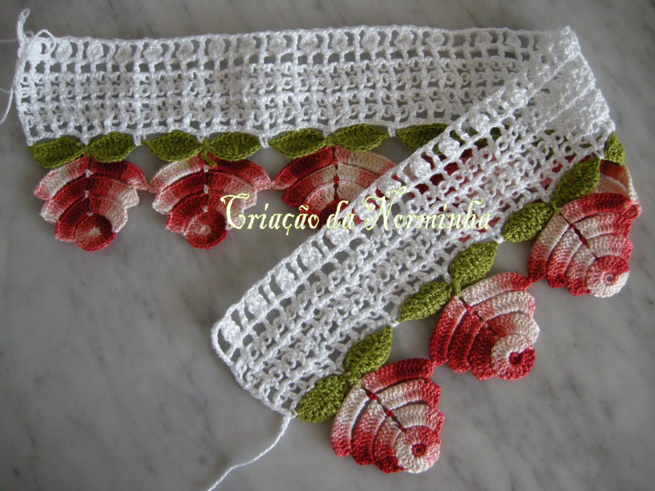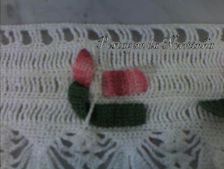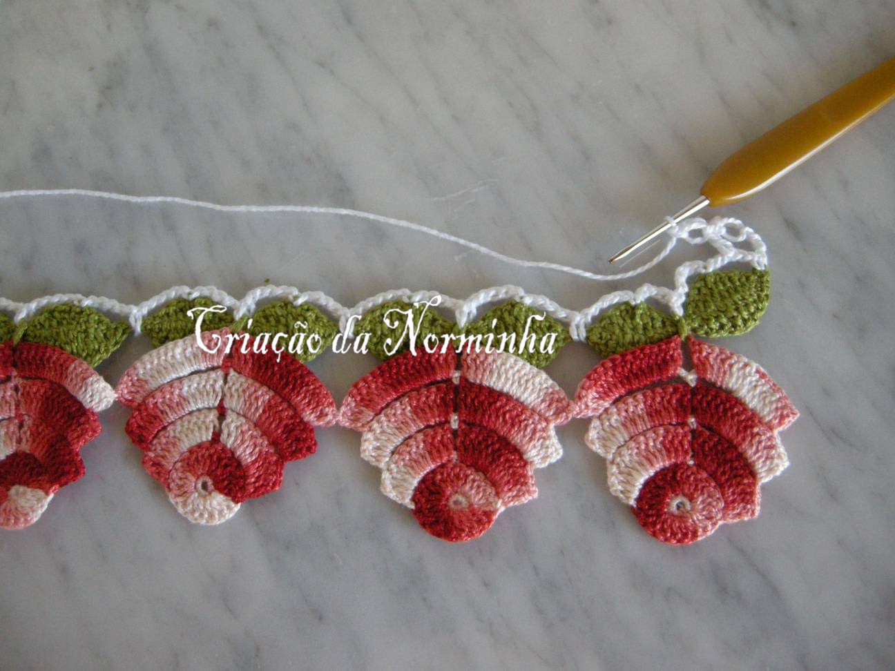 Centralizar as Rosas, que são feitas na quantidade desejada (sem grandes dificuldades), e emendadas nas ultimas carreiras para então, se fazer a moldura das folhas ...