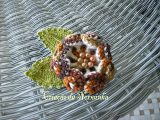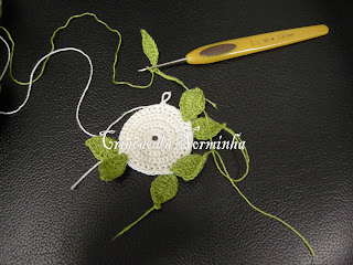 Depois do BROCHE (base) ficar pronto, contorno as pétalas no pt baixo, com linha matizada; faço as folhas em dupla e vou pregando; fixando pelo meio delas, no momento em que estou crochetando a base de acabamento, distribuindo em quatro cantos;