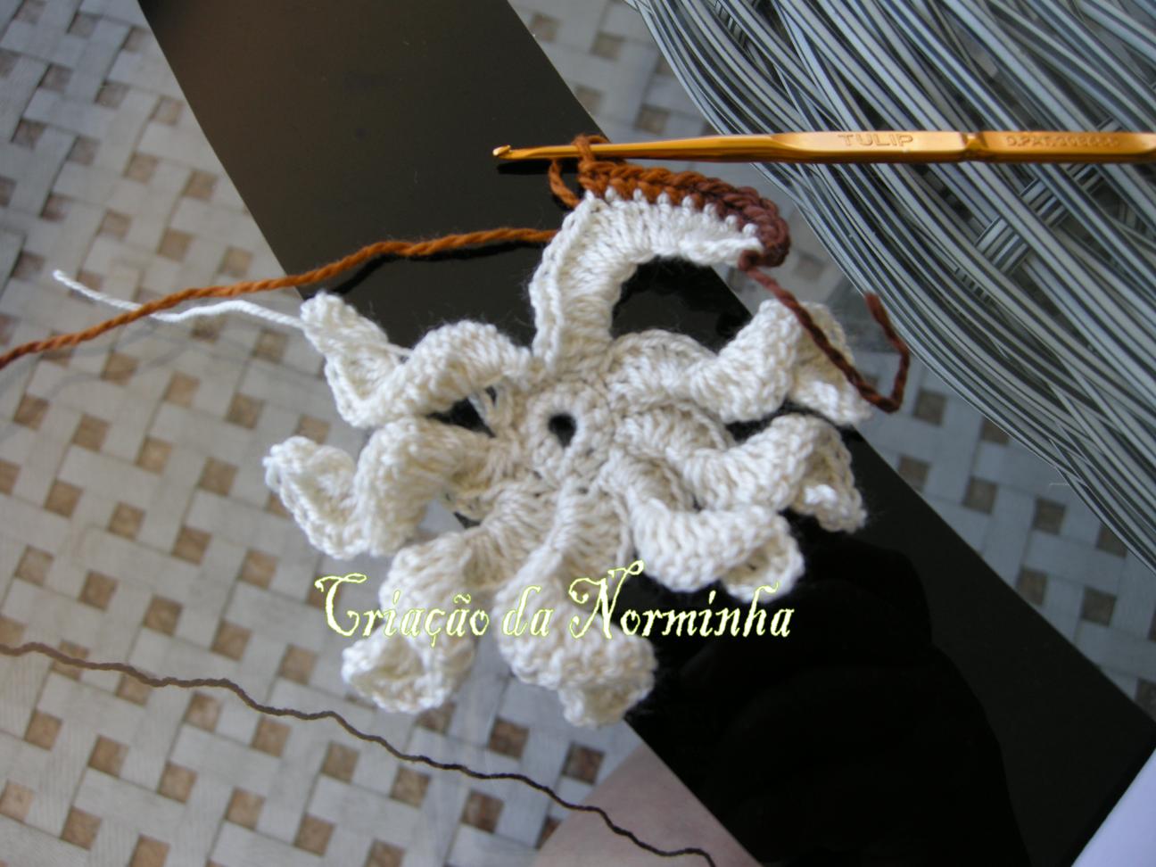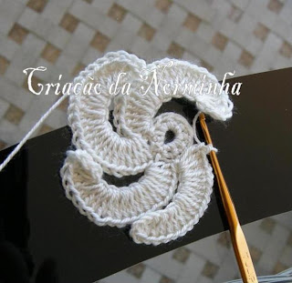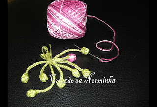 Com correntinhas de tamanhos irregulares, e pontos altos(4), formando 1 ponto pipoca nas pontas, faço estes pendões; com agulha comum, bordo os detalhes de um botãozinho de rosas, como mostra a foto; Depois prendo tudo na base e monto as rosinhas por cima, prendendo com agulha; se preferir, pode usar cola para artesanatos.