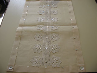 Há tempos andei procurando um Trilho para mesa que tivesse os detalhes destas almofadas. Pois em minhas buscas constantes, encontrei esta maravilha de Trilho... do jeitinho que eu queria! Detalhes em botões madrepérolas e croche no seu detalhe principal, além de ser branco! Amei!!!