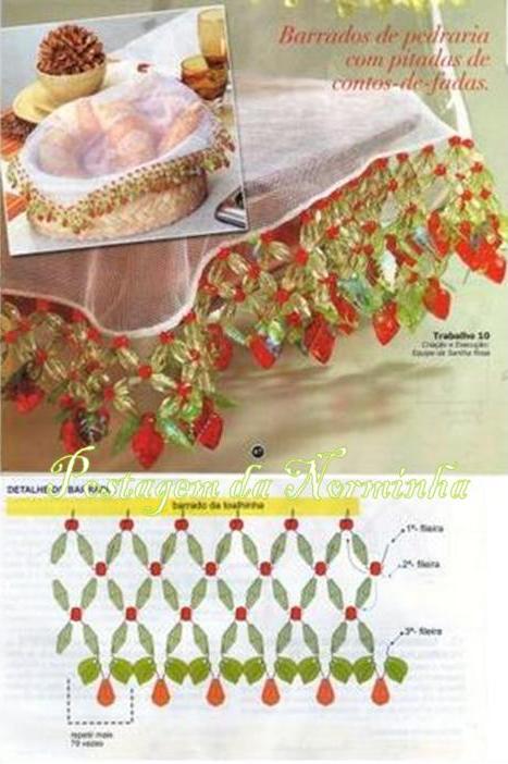 Barrados simples, incrementados com pérolas (toalha lilás), missangas pratas (toalha branca) e fitas.