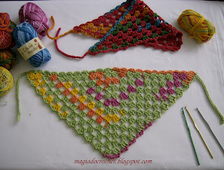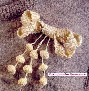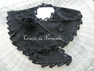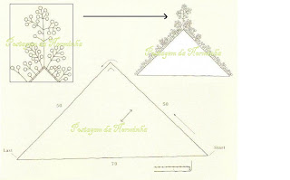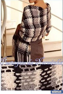Depois do xale definido, com a linha colorida (tons degradês), cortar 48 fios de cada cor, com 200 cm comprimento e com a agulha sem ponta, passar em grupo de 4 fios e fazer o entrelaçado conforme distribuição : 4 cru, 2 fileiras preto; 5 cinza, 2 fileiras cru; 4 preto, 2 fileiras de cinza; 4 cru, 2 fileiras de preto;5 cinza, 2 fileiras de cru; 4 preto finalizando; deixar sobras de 20 centímetros para as franjas.